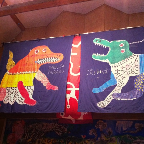 子供たちが書いた文字や絵が元々あり、それに青木さんのアートや渋さ独特のオブジェが加わって、